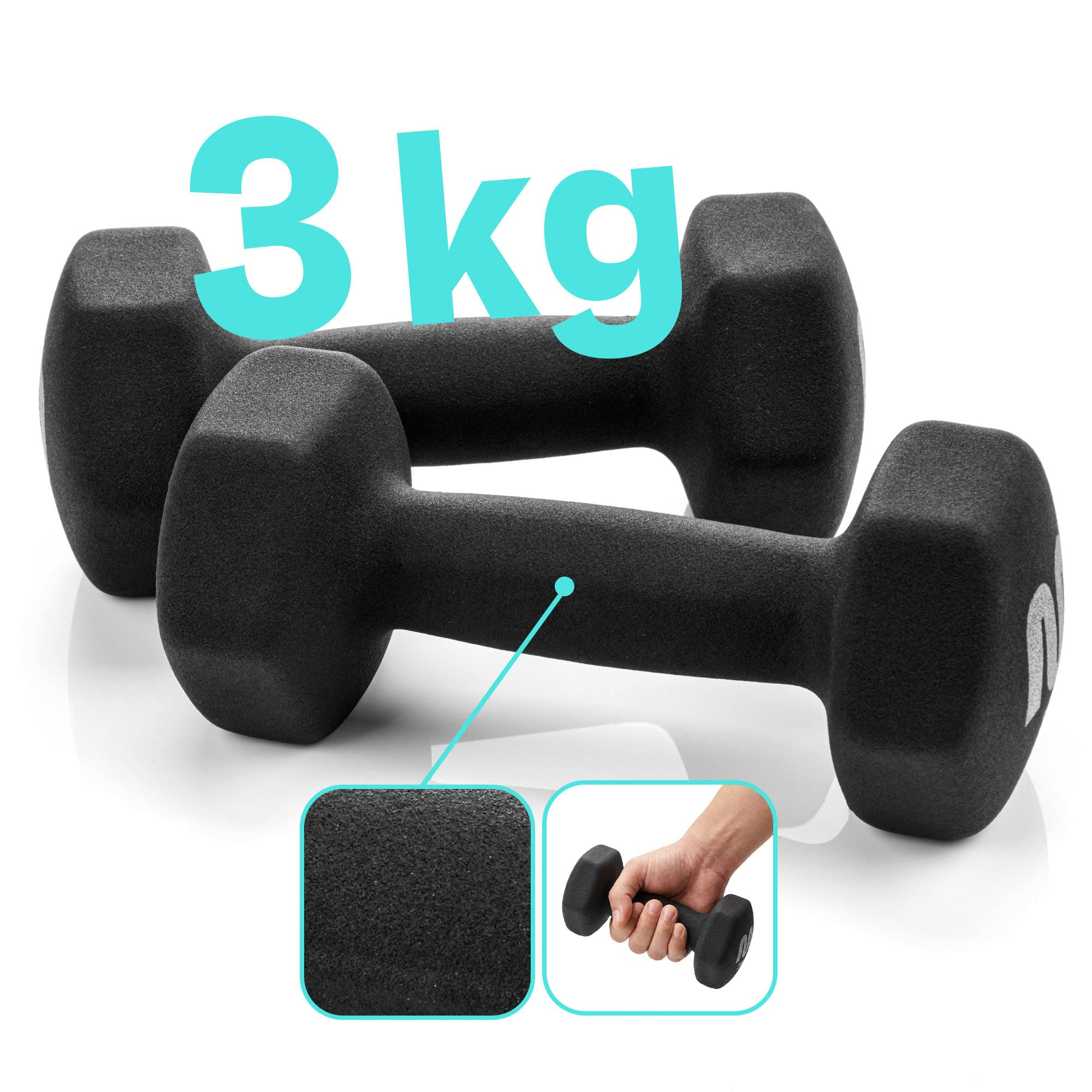 - Unbegrenzte Möglichkeiten – im Set finden Sie ein Paar Hanteln mit einem Gewicht von 2×3 kg. Dank vielseitiger Übungen können Sie Ihre Muskeln stärken, die Figur straffen sowie Muskelmasse aufbauen! In unserem Shop sind zudem Gewichte in verschiedenen Gewichtsklassen erhältlich: 5, 3 und 2 kg – wählen Sie das passende Gewicht für sich!